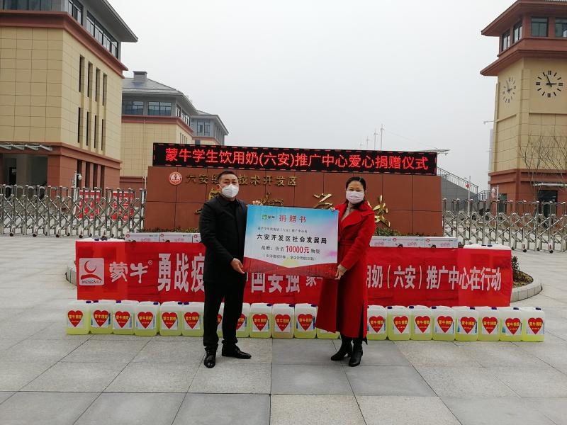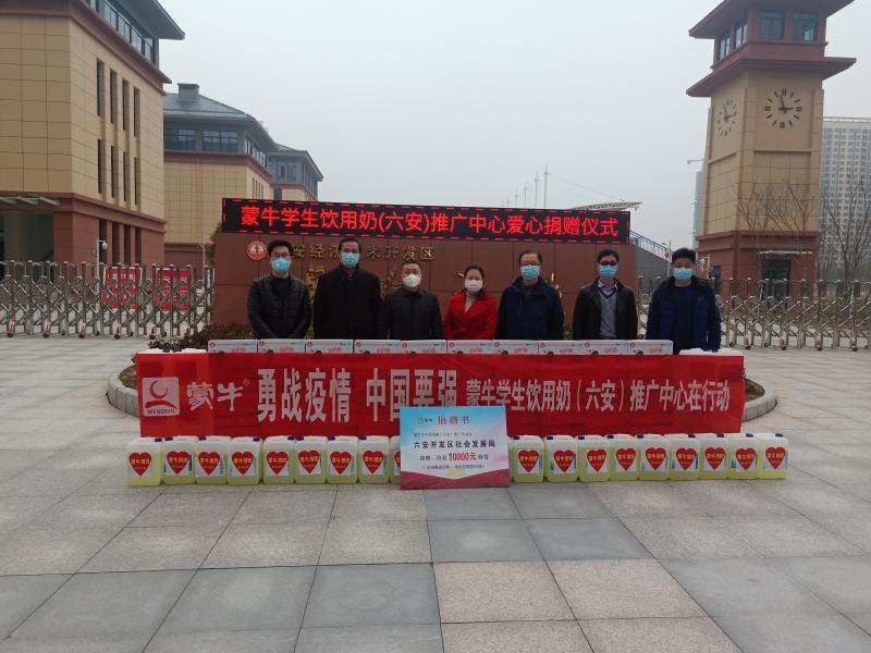2月25日下午,蒙牛学生饮用奶(六安)推广中心向六安开发区教育系统捐赠价值1万元的84消毒液和学生饮用牛奶等物资,缓解我区教育系统开学前疫情防控物资紧张局面。社会发展局副局长张静、蒙牛学生饮用奶(六安)推广中心总经理陈俊云、开发区中心校负责人等参加捐赠仪式。