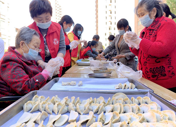 2021年10月12日,安徽省六安经济技术开发区妇联和爱心企业志愿者与辖区六安静安养亲苑老人一起包饺子,喜迎重阳节的到来。