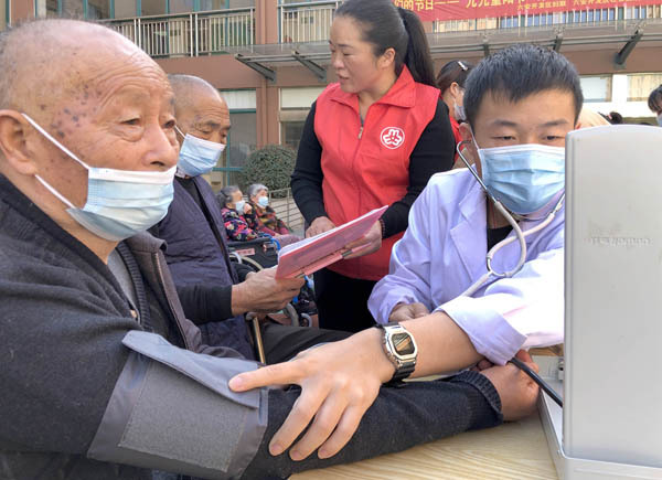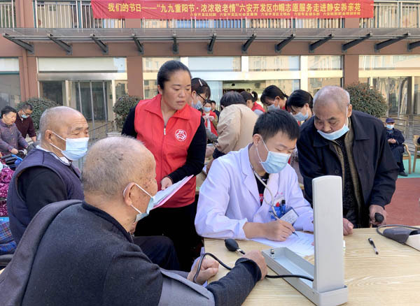 2021年10月12日,安徽省六安经济技术开发区妇联志愿者和医务人员为辖区六安静安养亲苑老人测量血压、检查身体。