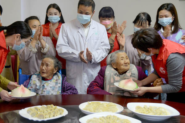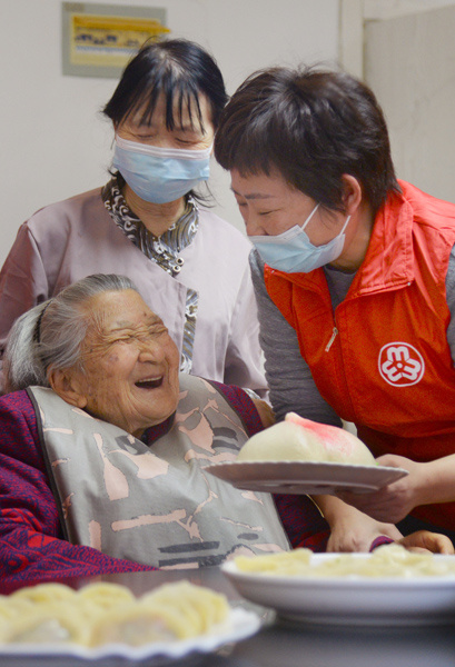 2021年10月12日,安徽省六安经济技术开发区妇联和爱心企业志愿者为辖区六安静安养亲苑95岁以上的老人送寿桃,喜迎重阳节的到来。
