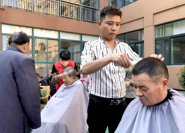 2021年10月12日,安徽省六安经济技术开发区妇联和爱心企业志愿者为辖区六安静安养亲苑老人理发。