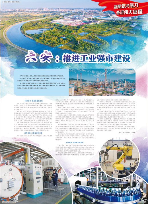这份亮丽“成绩单”,折射出六安工业发展的强大韧劲和巨大潜力。近年来,六安深入实施绿色振兴赶超发展战略,坚定不移推进工业强市建设,在工业大潮中奋楫扬帆、行稳致远,呈现稳中向好、稳中有进的态势。
