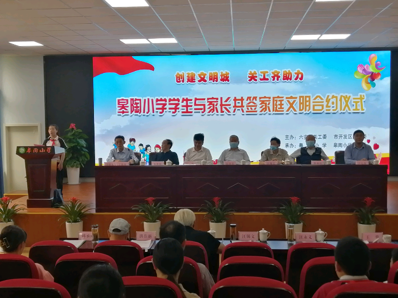 9月28日上午,由六安市关工委、六安开发区关工委主办,皋陶小学、皋陶小学关工委承办的“创建文明城 关工齐助力”皋陶小学学生与家长签订文明合约仪式在六安开发区皋陶小学举行。市关工委主任汪永义、常务副主任汪锡文,六安开发区工委副书记王燊出席仪式,市关工委相关领导及金安区、裕安区、叶集区、六安开发区、市直关工委领导,皋陶小学部分学生、学生家长、老师代表共约60人参加了签约仪式。