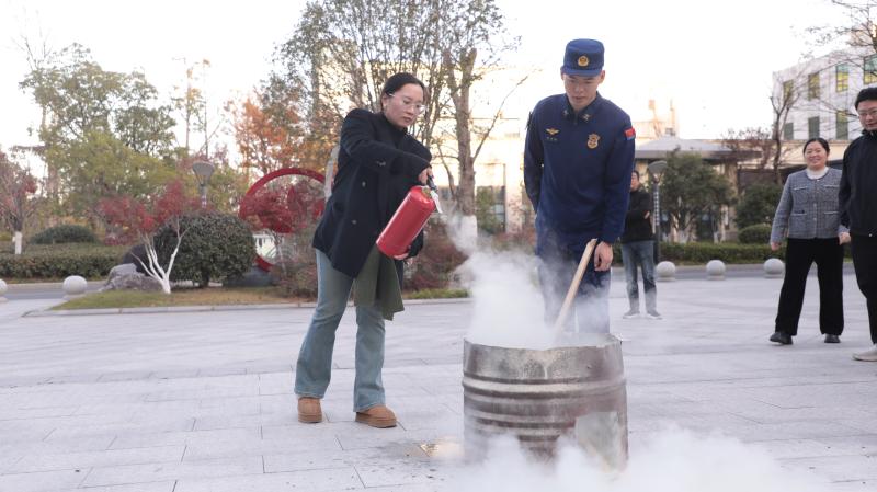 实操环节,消防救援大队队员现场搭建“模拟火场”,演示干粉灭火器的“一提二拔三握四压”操作口诀,参训人员亲身体验,从判断风向、选择站位到控制喷射距离,专业人员全程指导纠正动作。