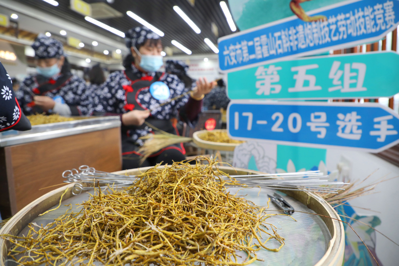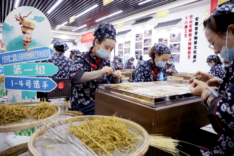 10月30日,安徽省六安开发区九仙尊石斛文博园,参赛选手在进行霍山石斛非遗炮制技艺实操竞技。 34名来自安徽省六安市霍山石斛产业相关企业的技术职工采取理论+实操的方式进行切磋竞技,旨在弘扬劳模精神、劳动精神、工匠精神,提高霍山石斛炮制的质量和工艺水平,进一步推动霍山石斛非遗炮制技艺的传承,为霍山石斛产业发展赋能。