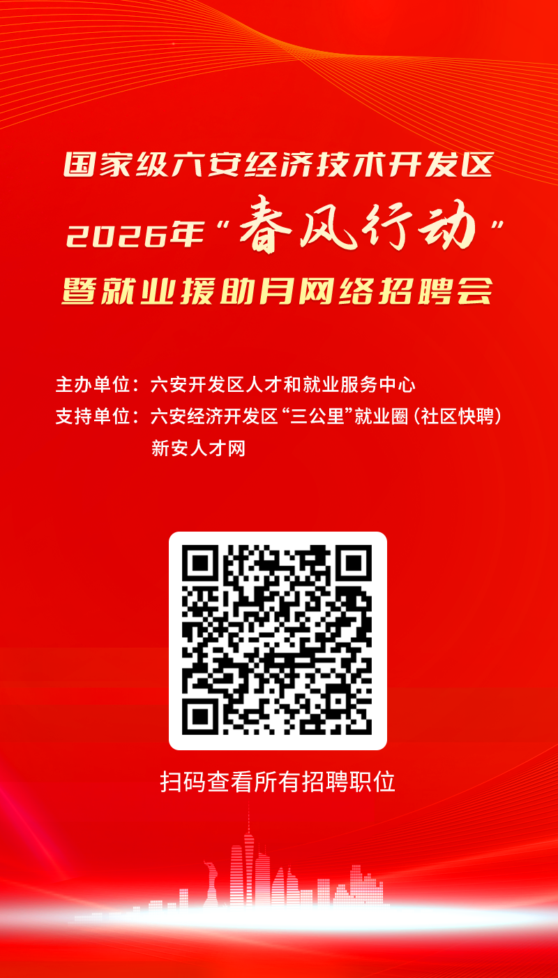 诚邀各位求职者于活动期间,重点关注并访问“新安人才网” ,进入国家级六安经济技术开发区2026年”春风行动“暨就业援助月网络招聘会专属页面,即可把握机遇,畅通求职之路。