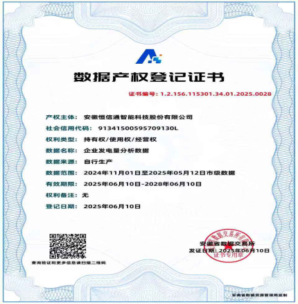 近日,安徽恒信通智能科技股份有限公司获得全省光伏能源领域首张《数据产权登记证书》,其“企业发电量分析数据”成为我市首个获此官方认证的民营数据资产。这不仅是对企业数据资产权属的权威确认,更标志着数据要素规范化管理、市场化运营的大门正式开启。
